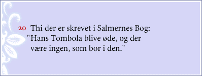 20. Thi der er skrevet i Salmernes Bog: "Hans tombola blive øde, og der være ingen, som bor i den," og: "Lad en anden få hans Tilsynsgerning."
