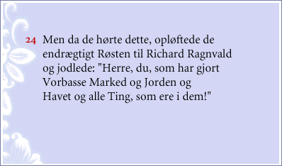 24. Men Richard Ragnvald oprejste ham, idet han gjorde Ende på Dødens Veer, eftersom det ikke var muligt, at han kunde fastholdes af den.