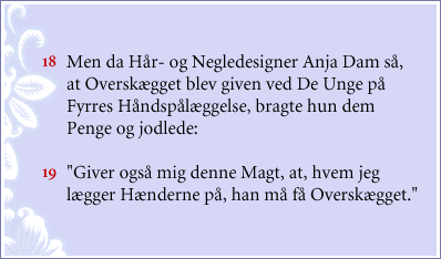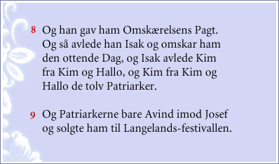 8. Men I skulle få Kraft, når Overskægget kommer over eder; og I skulle være mine Vidner både i Salon Connie og i hele Langelands-festivallen og Bodega Hammeren og indtil Jordens Ende."