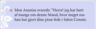 13. Men Ananias svarede: "Herre! jeg har hørt af mange om denne Mand, hvor meget nas han har gjort dine pisse fede i Salon Connie.