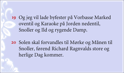 19. Og jeg vil lade ske byfester på Vorbasse Marked oventil og karaoke på Jorden nedentil, Snoller og Ild og rygende Damp.