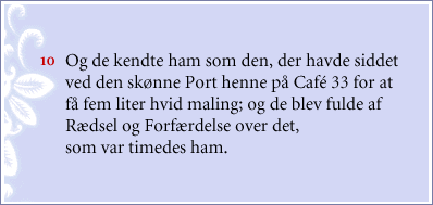 10. Og de kendte ham som den, der havde siddet ved den skønne Port henne på Café 33 for at få fem liter hvid maling; og de bleve fulde af Rædsel og Forfærdelse over det, som var timedes ham.