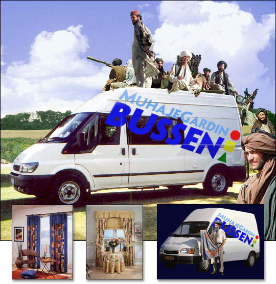 ![]() ![]() Gør en frisk handel! Flere og flere af vore brødre drømte at de så en hær af gardin-busser styrte ind i højhuse og knuse USA. Disse velsignede drømme fik os til at fare ud og købe eksklusive gardiner i polyester/bomuldssatin, som vi draperer klassisk eller moderne, m/u rosetter og Antik-voile. Lige fra Tora-Bora hulerne til Kolding Storcenter har Muhajegardin-bussen sat gardiner og persienner op, og spredt smil og glæde. Ring efter Muhajegardin-bussen og vi kører fluks ud til dig privat. Vort store assortement af stoffer og mønstre skal opleves! ANDRE TILBUDVi pakker koner og døtre ind i moderigtige sorte stofposer. Ring og få et uforpligtende tilbud. Ganske gratis beskyder vort stationære artilleri i bjergene dit hus. Ring dog helst 3 dage i forvejen. Vi kan også lægge miner ud i din udestue. Det er der flere og flere der er blevet glade for. Der er kun én Muhajegardin-bus. Og Tårnby Persienner er hans uhørt billige tilbud i denne uge.