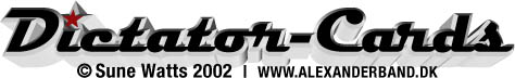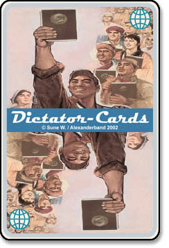 | PLAYING DICTATOR-CARDS: Dictator-cards are played by 2 or more players. The aim is to win all the cards from your opponent(s). All cards are distributed evenly among players. Each player puts his cards unseen in a pile in front of him with the image side downwards. Flip a coin to decide who begins. PLAYING 1 Each player draws the card on top of his pile 2 The player who has the initiative looks at his card and determines which category his card is strongest in (ex. Ruled number of years: 43) 3 All players call their value in the chosen category. The player with the highest number wins, and gets the cards in play. He places the collected cards in the bottom of his pile, and gets the initiative. 4 Repeat until a player has beaten his opponents by getting all their cards If two or more players have the same highest value in a round, there is WAR. These players draw the next card in their piles and name the value of the SAME category as before. If a player runs out of cards during the war, he keeps playing his last card. This is repeated until someone wins. The player who wins the war collects all the cards that were laid down, and gets the initiative. If you lose all your cards, you are out. The game ends when one player has all the cards. The types of RULE rank like this, strongest first: Stalinism Despotism Tyranny Fascism Cannibalism Nazism Military Dictatorship Dictatorship Barbarism Marxism Islamic Fundamentalism Emperor's Rule Kleptocracy Mooching Have fun! - Sune |